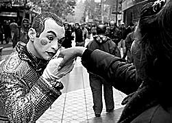 Cuando llegaba a casa de su amigo se tomaba un café. Luego encendía un cigarrillo, y mientras fumaba, se sentaba frente al espejo, desplegaba la caja de pinturas y se maquillaba. Primero extendía una capa de crema hidratante que le servía de base, sobre la cual comenzaba a cubrir la cara de un tono pálido, algo más intenso que el color carne. A continuación delineaba unas cejas negras arqueadas, se pintaba los labios de rojo y dos pequeños chapetones rosados a ambos lados, uno en cada pómulo. Después se engominaba el pelo que peinaba hacia atrás. Y finalmente se enfundaba un traje con colores brillantes, chillones, rematado por unos bordes negros, verdes y rojos, y cubría las manos con guantes blancos.